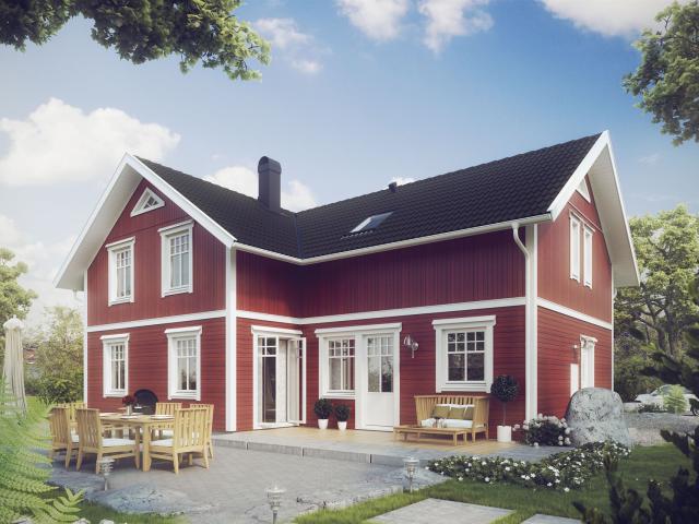 Dieses schwedische Landhaus mit seiner Drei-Giebelkonstruktion und der vorgesetzten Veranda mit Balkon verleihen dem Haus eine besondere Note und unterstreichen durch perfekte Proportionen die harmonische Architektur schwedischer Landhäuser. Der gut durchdachte Grundriss ermöglicht einer vierköpfigen Familie großzügigen Lebensraum.