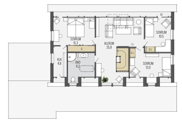 Über eine 2/4 gewendete Treppe erreicht man das Obergeschoss mit vier Räumen und einem Badezimmer. Besonders praktisch ist der begehbare Schrank, der vom Elternschlafzimmer zu erreichen ist. Der Verzicht auf Flure lässt hier einen 25,8 m2 großen Gemeinschaftsraum entstehen, den sich beispielsweise die Kinder teilen.