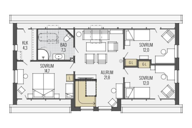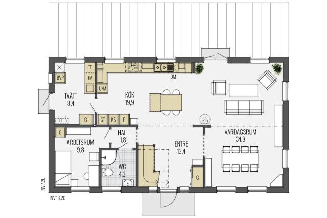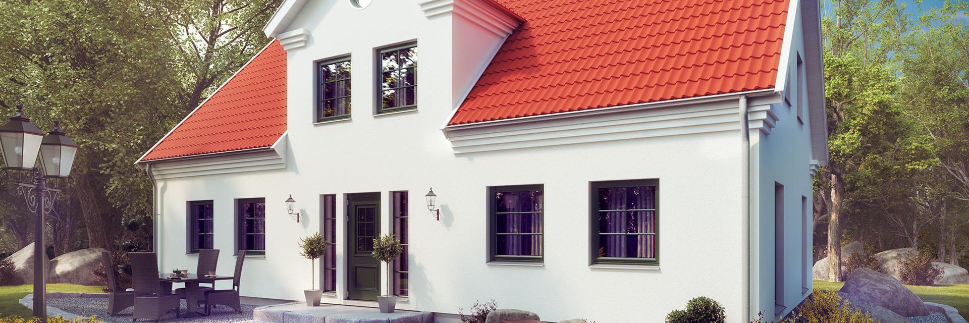 ... ist von den Traditionen der südlichen schwedischen Provinzen geprägt. Weiß verputzt, mit markantem Dachfries unter dem Dachüberstand und mit ausgewogen proportionierten Fenstern bekommt das Haus einen klaren, harmonischen Charakter. Die im Kontrast zum Putz graue Dekorfarbe der Details verstärkt den Ausdruck der Linienführung.