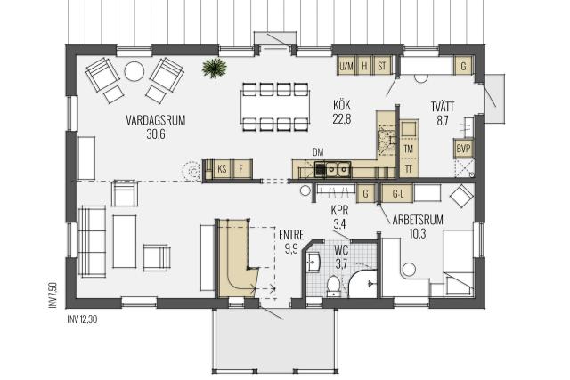 Trotz seines traditionellen Aussehens bietet Tallbacken einen modernen Grundriss. In der offenen Küche trifft man auf ein schönes Esszimmer mit großer Fensterpartie. Das Wohnzimmer erhält sein Licht aus drei immelsrichtungen. Der direkt neben der Küche liegende Hauswirtschaftsraum verfügt über einen Nebeneingang.
