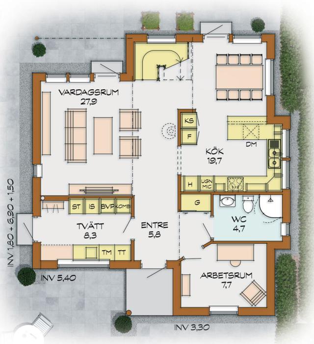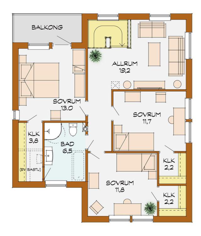 Aspliden ist ein beeindruckendes Haus mit einem modernen und funktionellen Äußeren. Ein Haus mit geraden Linien, spannenden Fenster Bereichen und einem Materialmix aus Profilholzfassade und Putz. Zwei Vollgeschosse bieten nicht nur eine Menge Platz, sondern sorgen auch auf beiden Ebenen für ausreichend Raumhöhe. Ein Entwurf im schwedischen Funkis-Stil der '60er Jahre des letzten Jahrhunderts.