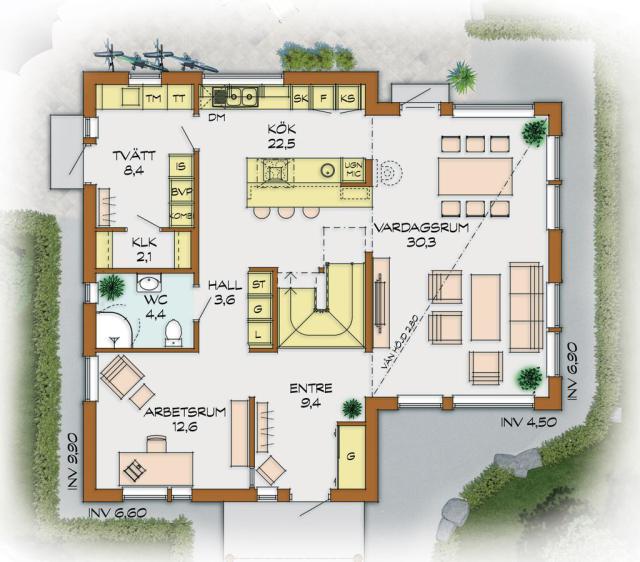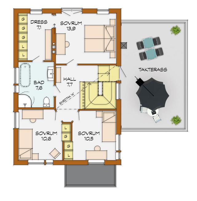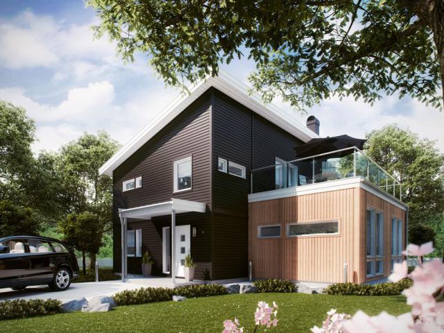 Ein unkonventionelles, zweigeschossiges Haus, das seine Wurzeln im Funktionalismus hat. Das Wechselspiel zwischen den beiden Baukörpern trägt zu einer harmonischen Dynamik und einem interessanten Erscheinungsbild bei. Das Dach auf dem niedrigen Baukörper ist zu einer großen Terrasse ausgebildet worden. Hier können Sie Ihr Frühstück im Freien, ein entspanntes Sonnenbad oder Grillfeste für Freunde und Bekannte genießen.