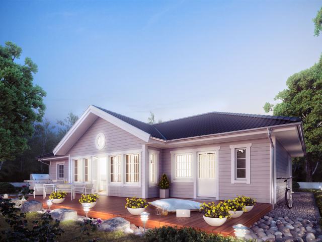 ... eingeschossiges Haus, mit einem aufwendig gewalmten Dach, im New-England-Style. Das an der Vorder- und Rückseite vorgezogene Satteldach mit den runden Giebelfenstern betont die architektonische Mitte des Hauses, beeindruckend unterstützt durch die großzügige Kathedraldecke im Wohnbereich und den spannenden Lichteinfall.