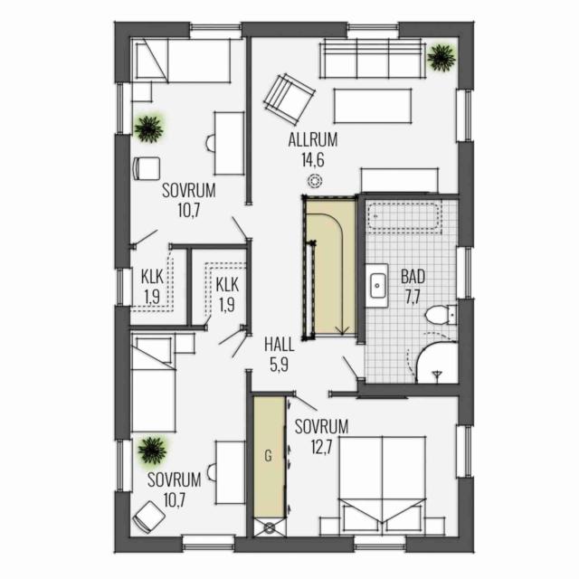 Für Familien mit Kindern bietet das Obergeschoss kurze Wege um den Alltag und vor allen Dingen die eventuell auftretenden nächtlichen Störungen zu meistern. Später wenn die Kinder ausgezogen sind oder Gäste zum Schlafen vorbei kommen lassen sich die kleinen Zimmer leicht in Arbeits-, Gäste- oder Ankleidezimmer umwandeln, oder zu etwas anderem ganz nach Ihren Bedürfnissen und Wünschen.