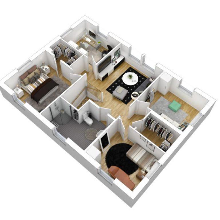 Die obere Etage bietet Platz für vier Schlafzimmer, ein Badezimmer, einen zentralen Wohnbereich und zwei große begehbare Kleiderschränke. Das Badezimmer ist zentral angeordnet und von den Zimmern gut erreichbar. Im Obergeschoss gibt es keinen ungenutzten Quadratmeter, was die Anordnung der Räume und deren Nutzung sehr effizient und intelligent macht.