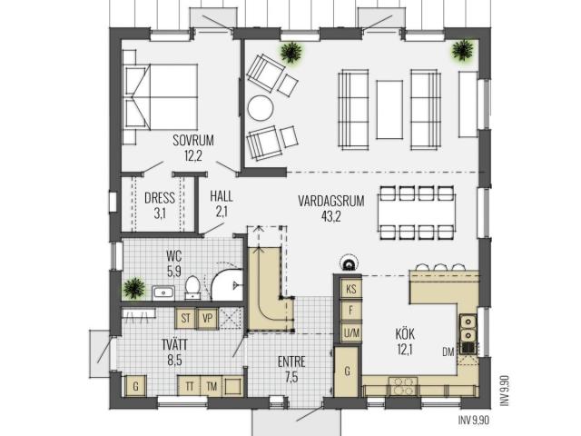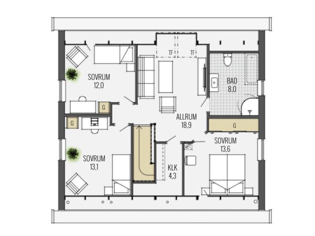 Der Grundriss ermöglicht es Ihnen aber auch ein weiteres Zimmer vom Wohnbereich abzutrennen, falls der Bedarf da sein sollte.