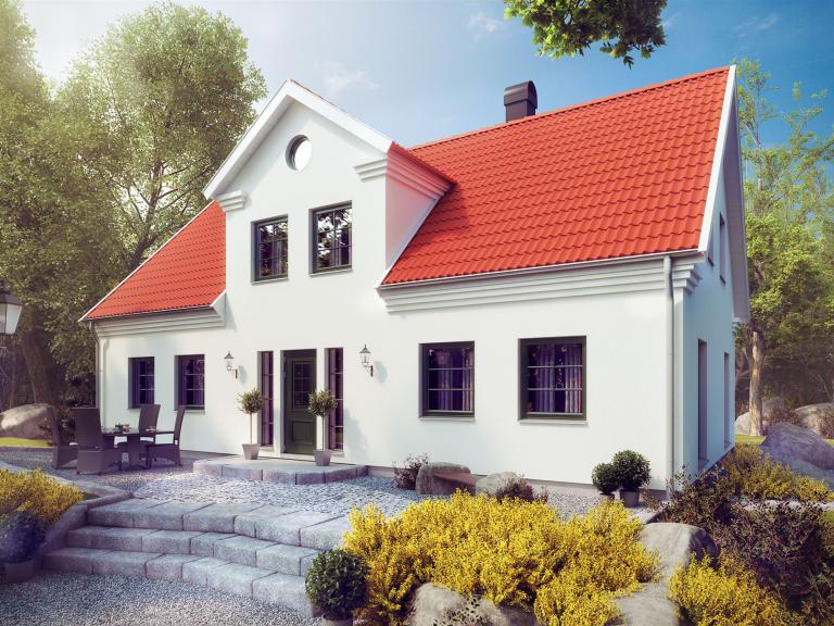 ... ist von den Traditionen der südlichen schwedischen Provinzen geprägt. Weiß verputzt, mit markantem Dachfries unter dem Dachüberstand und mit ausgewogen proportionierten Fenstern bekommt das Haus einen klaren, harmonischen Charakter. Die im Kontrast zum Putz graue Dekorfarbe der Details verstärkt den Ausdruck der Linienführung.