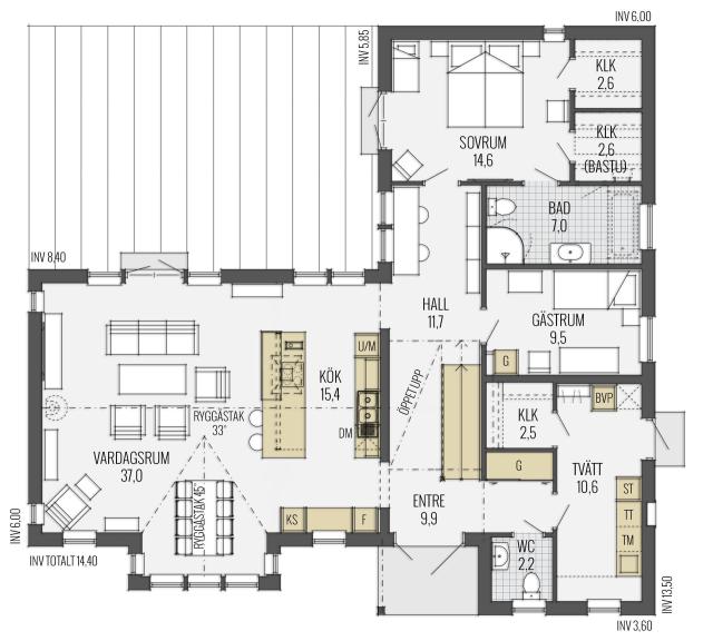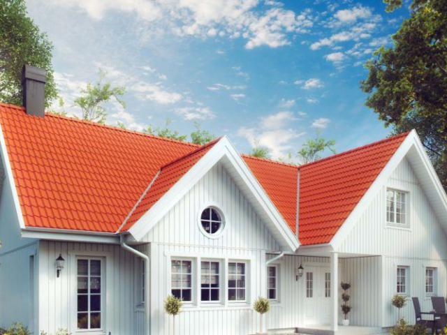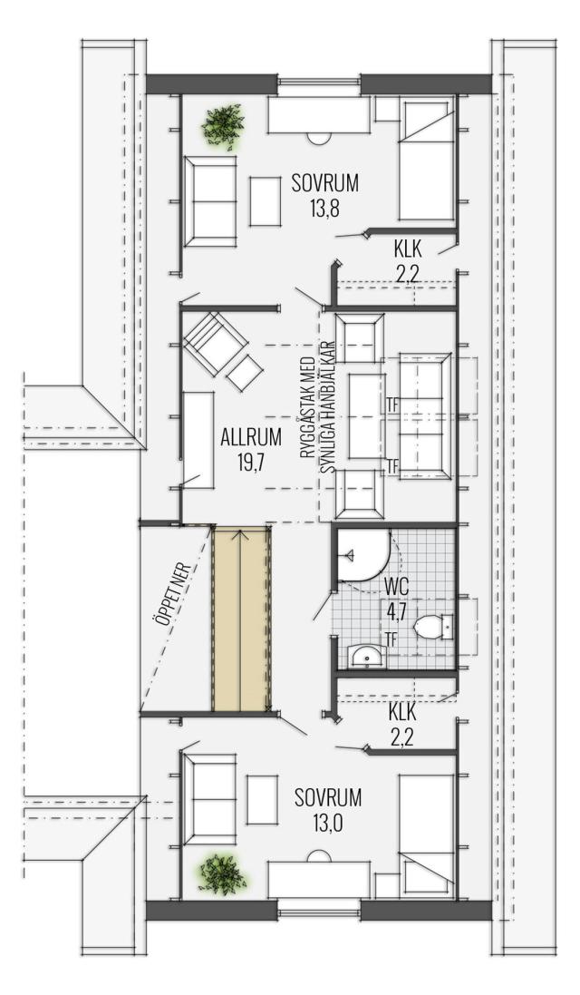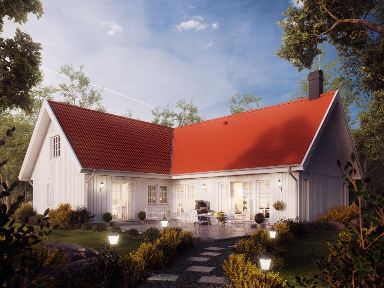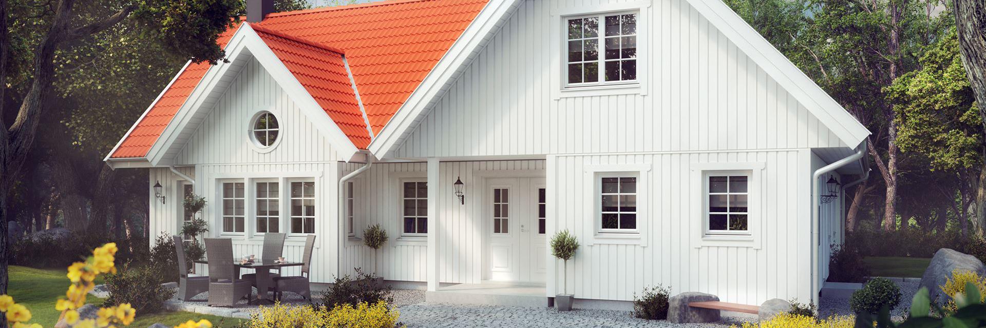 Mit seiner wohlproportionierten, romantisch anmutenden weißen Fassade und dem rot eingedeckten Dach ist Södergården ein Haus, in das man sich verlieben kann. Das runde Fenster und der überdachte Eingangsbereich verraten die Liebe zum Detail, mit der dieses Haus geplant wurde. Die Winkel des Baukörpers schaffen eine Behaglichkeit und Ästhetik, deren Mehrwert sich im praktischen Nutzen findet. Auf der Rückseite befindet sich eine große wettergeschützte Terrasse, die sowohl vom Wohn- als auch vom Schlafbereich zu erreichen ist.