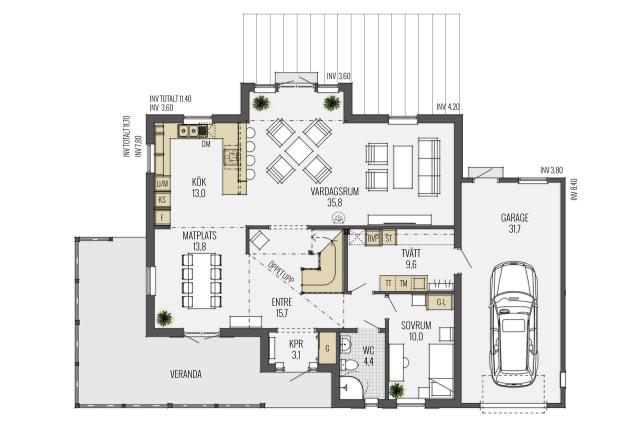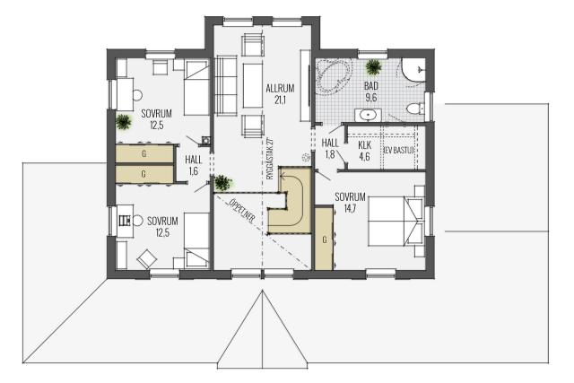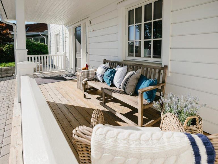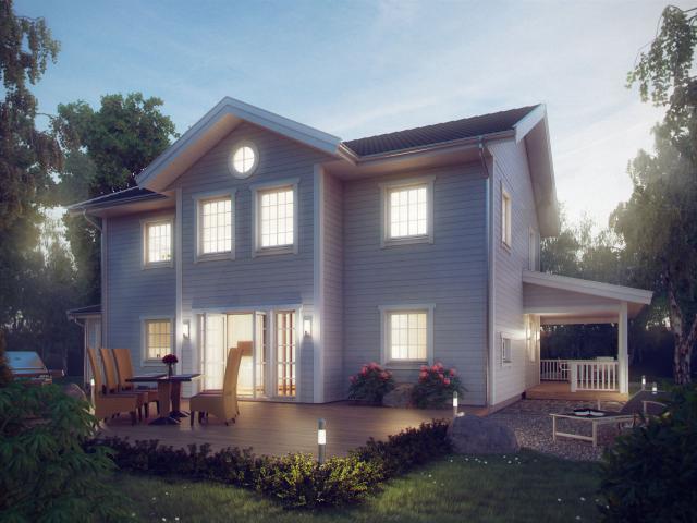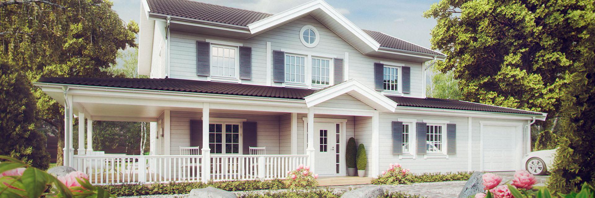 Bei diesem Entwurf ist es gelungen, die wesentlichen Merkmale des New-England-Style zu übernehmen. Die Frontansicht dieser prächtigen Villa wird bestimmt durch die symmetrisch angeordneten Fenster und durch die imposante Eckveranda, die im Kontrast zu der schlichten Holzfassade steht. 202 m² verteilen sich auf zwei Vollgeschosse.