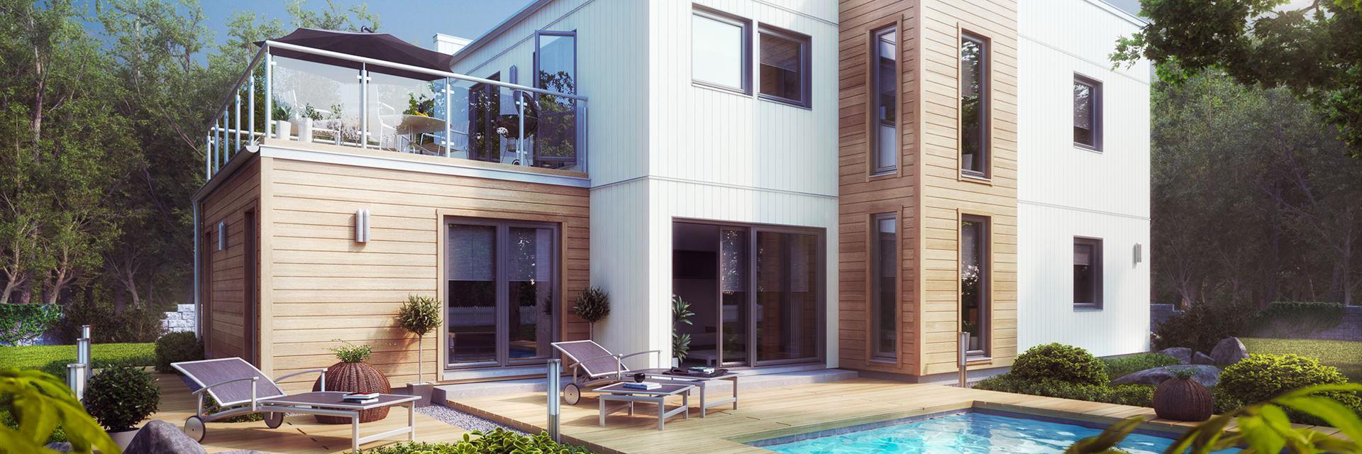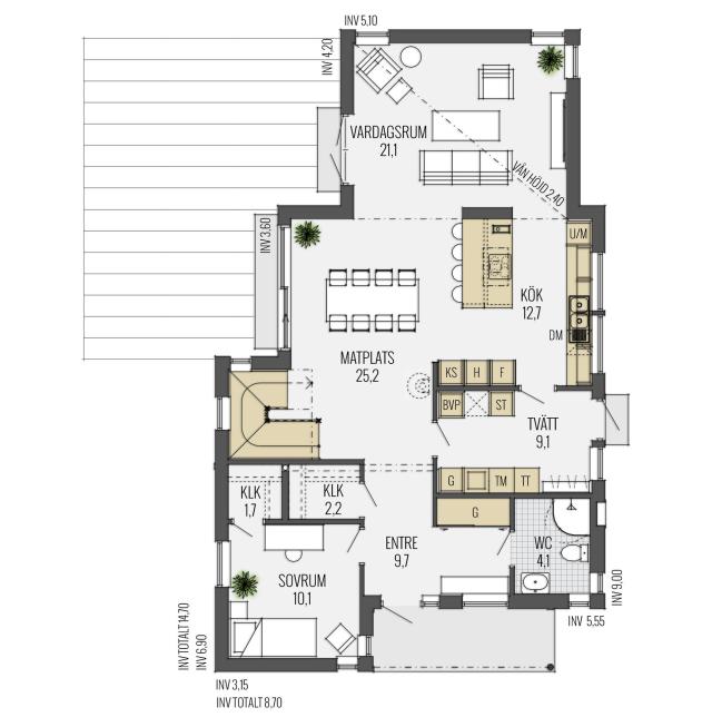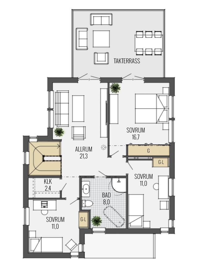 Vom Gemeinschaftsraum, dem in Schweden üblichen „Allrum“, gelangt man in die drei Schlafräume und ins Badezimmer. Das Platzangebot auf dieser Ebene passt zu der Vorstellung, die sich der Betrachter dieser gut durchdachten Planung macht. Auf kleineren Grundstücken kann die große Terrasse fehlende Grundstücksgröße spielend ausgleichen.