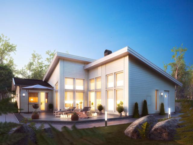 Larvik ist ein Haus mit einer sehr gut disponierten Planungslösung, die ganz ohne Flure auskommt. Hier findet man eine praktische Küche mit großer Kücheninsel und einem herrlichen Essplatz im verglasten Winkel. Küche und Wohnzimmer ineinander übergehend bieten viel Platz und eine hervorragende Lichtstimmung. Zum Elternschlafzimmer gehören ein Vollbad und eine große Garderobe die durch Schiebetüren begrenzt wird. Die Kinder verfügen über ihren eigenen Bereich mit zwei Schlafzimmern und einem Gemeinschaftsraum.