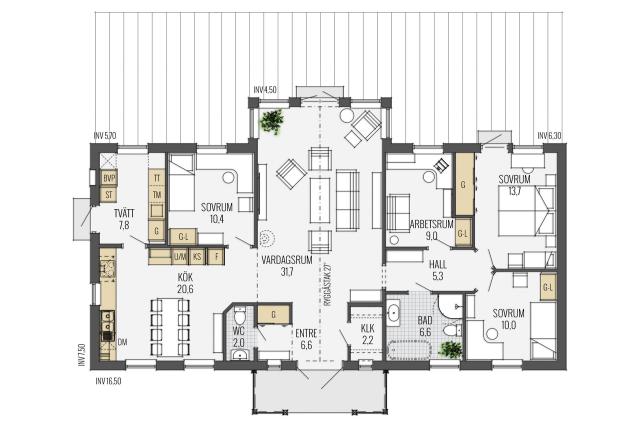Tallåsen ist ein typisch schwedisches Familienhaus. Die Bauweise entspricht sowohl der klassischen als auch der modernen Bautradition und ist unser meistverkaufter Bungalow. Durch die Mitte des Hauses verläuft eine Kathedraldecke, die zweifellos ein Highlight des Hauses ist. In den Wohnraum wird ungewöhlich viel Licht gespült, so entsteht eine besondere Atmosphäre, die man selbst einmal erlebt haben muss.
