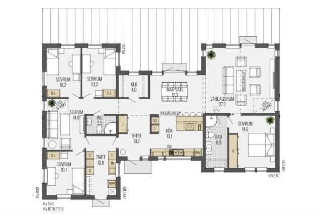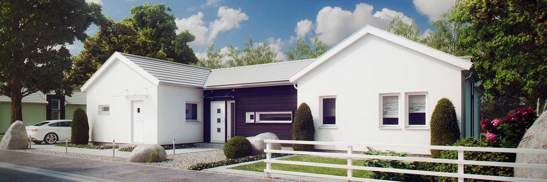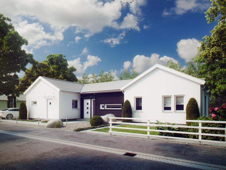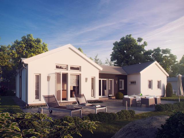 Der Vorteil dieser Planung liegt in der zentralen Funktion des mittleren Baukörpers. Von hier aus kann nicht nur jeder Raum des Hauses erreicht werden, sondern auch ein großer Koch- und Essbereich lädt die Bewohner zum Einnehmen der Mahlzeiten ein. In der offenen Küche ist Raum genug, um gemeinsam Rezepte auszuprobieren und zu kochen. Vom Elternschlafzimmer, das gleich neben dem Wohnzimmer liegt, gelangt man in das große Badezimmer mit Dusche und Wanne. Ein zweites Bad teilen sich Kinder und Besucher. Ganz praktisch lässt sich der Hauswirtschaftsraum über eine Nebeneingangstür auch von außen betreten. Ein begehbarer Kleiderschrank und ausreichend Stauraum runden das Platzangebot ab.