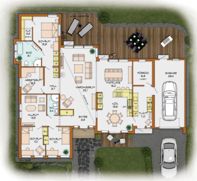 Im etwas abgeschirmten Elternteil des Hauses befindet sich das Badezimmer mit viel Platz für Individualisten. Hier lässt sich noch problemlos eine Sauna einbauen. Der Kinderbereich hat einen zusätzlichen Raum für Fernsehen und Internet. Außerdem gibt es einen Raum, der als Schlaf- oder Gästezimmer genutzt werden kann. Von der Diele aus bemerkt der Betrachter die enorme Großzügigkeit des Hauses. Durch den Hauswirtschaftsraum gelangt man in die Garage, dessen Tor einen schützenden Dachüberstand hat. Zu den weiteren Vorteilen des Hauses gehört eine Vielzahl von Stauräumen.