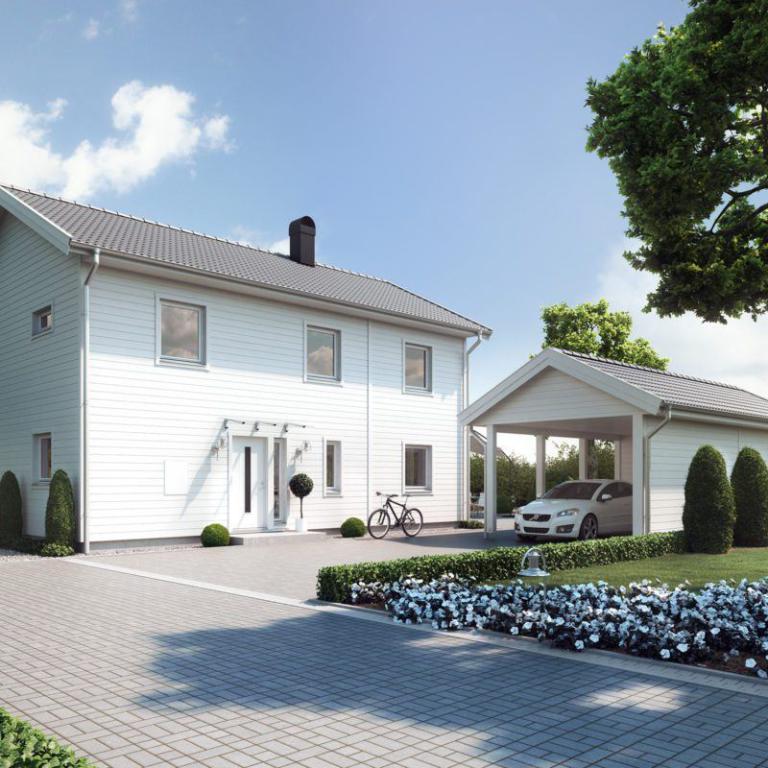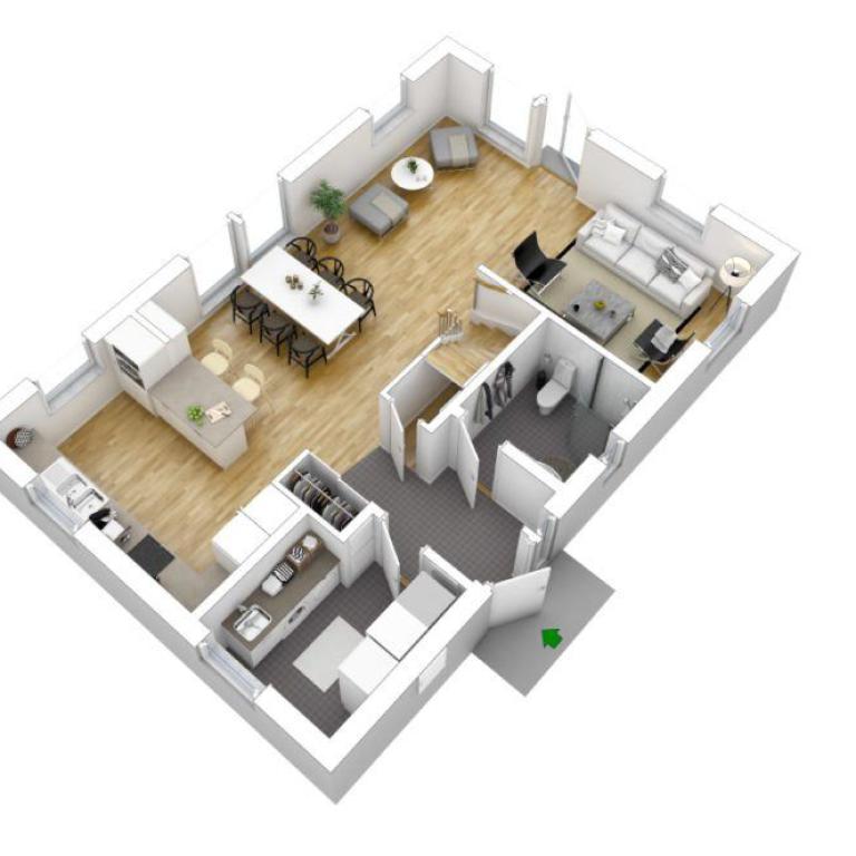 Links und rechts vom Eingangsbereich befinden sich der Hauswirtschaftsraum und ein Gäste-WC mit Dusche. Beim Betreten des Hauses erhalten Sie schon einen ersten Blick auf die helle und großzügige Küche sowie den sich anschließenden Essbereich. Wohn-, Essbereich und Küche sind offen miteinander verbunden. In der Mitte wurde die Treppe mit darunter liegenden Stauraum angeordnet.