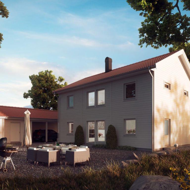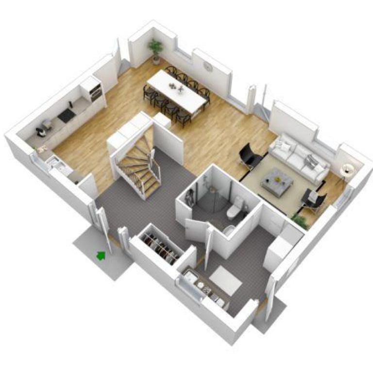 Eine sehr großzügige offene Raumaufteilung finden Sie im Erdgeschoss des Hauses PRIO 158. Schon beim Betreten des Hauses öffnet sich der Blick über den Wohnbereich in Richtung Terrasse. Um die in der Mitte des Hauses zentriert angeordnete Treppe kann man herumgehen, was wiederum ein zusätzliches Raumgefühl vermittelt. Wohnzimmer und Essbereich befinden sich im hinteren Teil des Hauses. Durch die Anordnung der Fenster und Türen an allen drei Außenwänden wirkt dieser Bereich sehr lichtdurchflutet. Im vorderen Bereich des Hauses befinden sich die Küche auf der einen Seite des Einganges und der Hauswirtschaftsraum sowie das Gäste-WC mit Dusche auf der anderen Seite. Küche, Eingangsbereich, WC und der Hauswirtschaftsraum liegen auf einer zueinander offenen Achse.