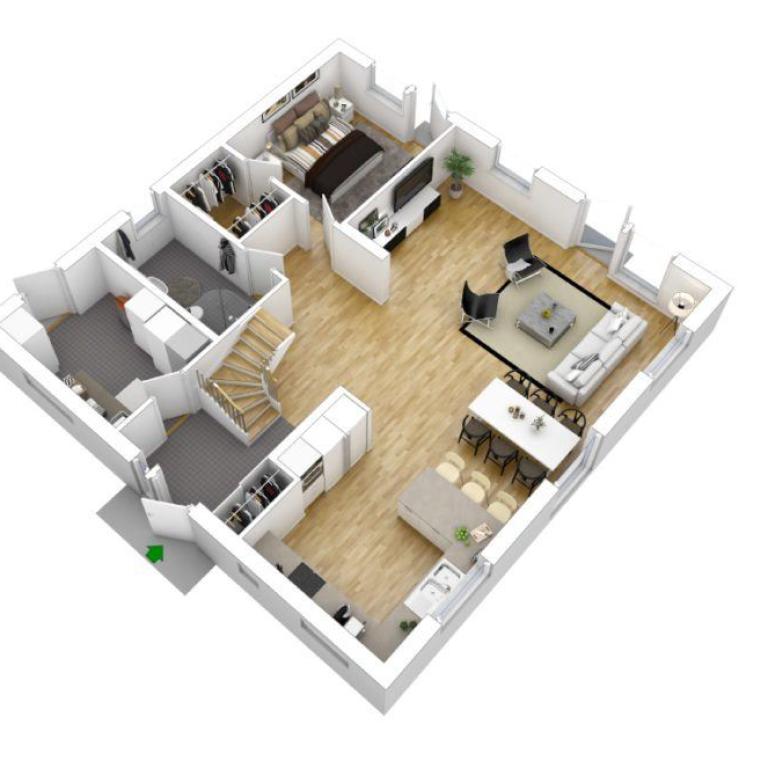 Der Eingangsbereich des Hauses hat keine Flure. Links und rechts befinden sich zunächst einmal ein Garderobenbereich und der Hauswirtschaftsraum. Als nächstes folgt die Treppe in den oberen Bereich des Hauses. Dahinter öffnet sich der eigentliche Wohn- und Essbereich und lädt zum Verweilen und Genießen ein. Eine offene Küche schließt sich an diesen Bereich an.